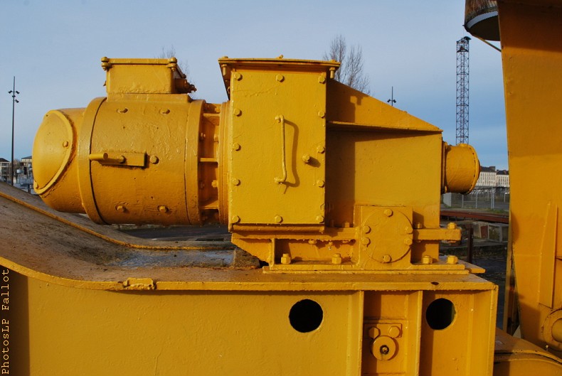 Photo 11 : Détail de la grue jaune. Des 2 grues “Titan” –symboles de la grande époque industrielle de la ville- la “jaune” est arrivée sur le site portuaire en 1955 avec la fonction de lever les blocs de bateaux pour le montage sur cale.