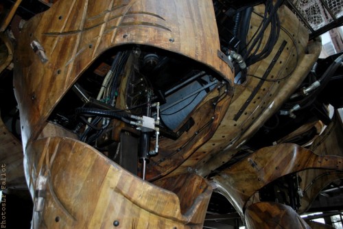 Photo 3 : Détail du Grand éléphant. "Les Machines de l’île « projet artistique totalement inédit. Né de l’imagination de François Delarozière et Pierre Orefice, il se situe à la croisée des « mondes inventés » de Jules Verne, de l’univers mécanique de Léonard de Vinci et de l’histoire industrielle de Nantes, sur le site exceptionnel des anciens chantiers navals."(Extrait du site)